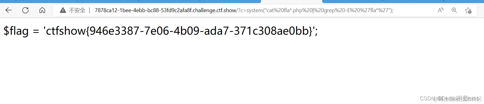 具体来说,它会使用系统的 “cat” 命令来输出文件名以 “fl” 开头且以 “g.php” 结尾的文件内容,并使用 “grep” 命令过滤掉不包含 “fl.g” 的行。最后,这个命令的输出会被赋值给变量 $c。