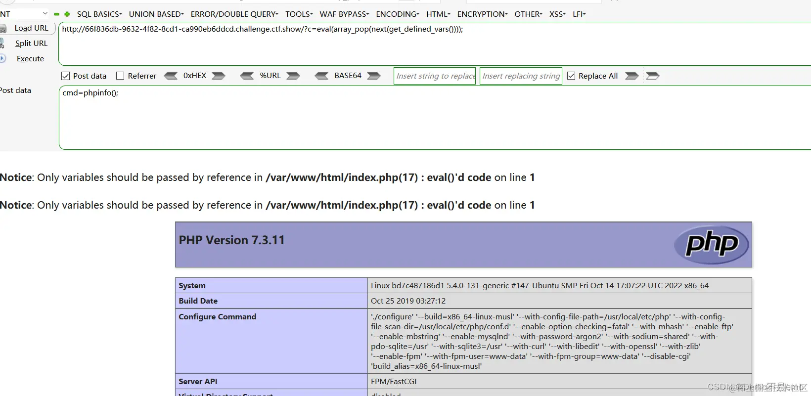 由于get_defined_vars()返回的是一个多维数组,我们用current()可以获取到GET数组,用next()可以获取到POST数组,然后用array_pop()取出POST数组里面的最后一个元素,再用eval执行就可以造成命令执行