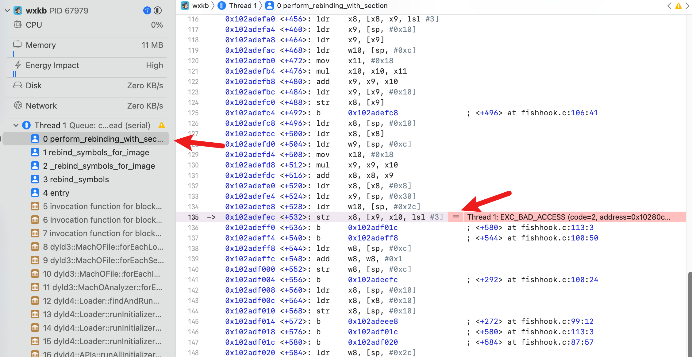 可以观察到这个报错是在 perform_rebinding_with 也即 fishhook 导致的