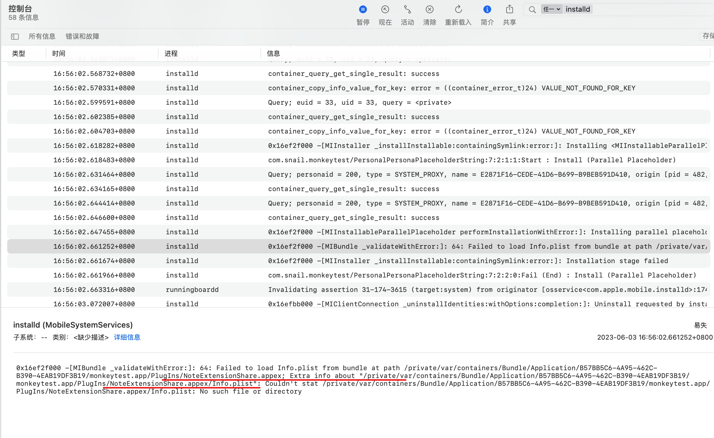 - 博主够研究了一周多,既然是 install 错误,那么看看 installd 的报错日志,发现是因为找不到 Plugins 的 info.plist 报错,但是 MonkeyDev 重签名的脚本会删除掉 Plugins/Watchs 文件,一定是有地方还带有 Plugins 相关的信息。