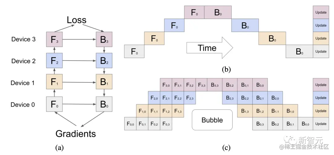 其中,至少有一些集群的连接带宽会比其他的集群低很多。但是作者表示,他并不是太明白OpenAI在如此高的管线并行度下,如何避免在每批中产生如下图这样的「泡泡」(huge bubbles),很有可能OpenAI就是生生地抗下了这些成本。