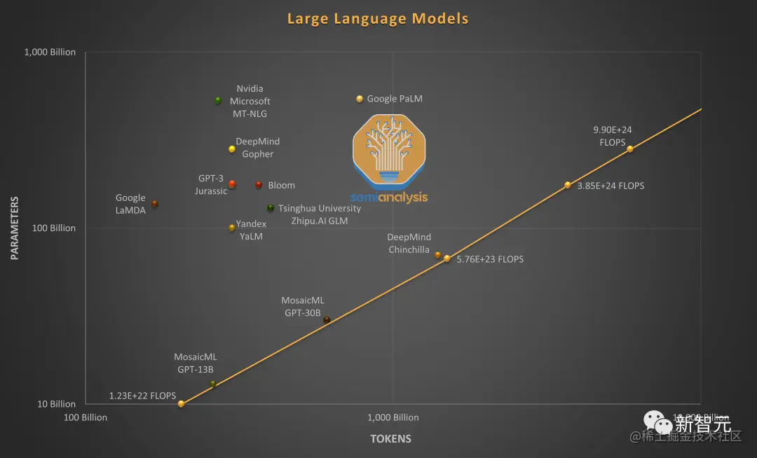 上图显示了一些已公开的先进模型各自的参数数量和token。图中的线是谷歌DeepMind的Chinchilla缩放观测值(平滑了较大的误差条),线上的每一点都显示了使用该参数和token数训练模型所需的理论FLOPS不过,爆料作者称到今年年底,至少将会有9个公司拥有超过上述大小的H100集群。