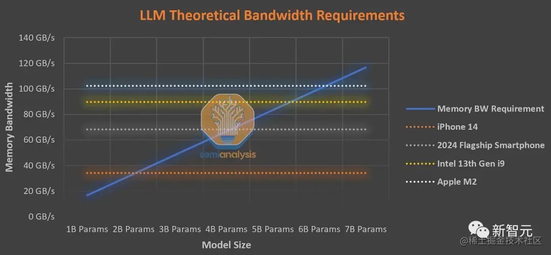 LLM理论带宽要求:经假设可得出,在iPhone 14上可跑的最大模型大小为10亿个FP16参数,或40亿个int4参数,这是基于智能手机的LLM的基本限制,任何更大的模型会无法被采用