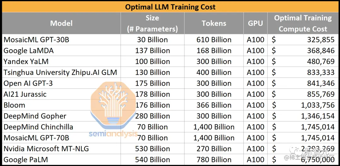 本表是在英伟达A100上训练模型的理论最佳成本,没有考虑所需的人力、ML Ops工具、数据收集/预处理、故障恢复、one-shot/few-shot学习示例、推理等,许多部分的成本高得惊人