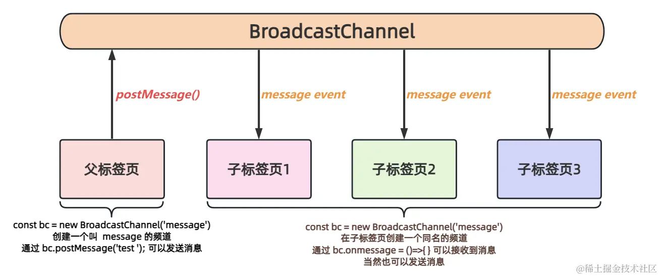 Broadcast Channel API 简单的使用方式,就如上图所示。