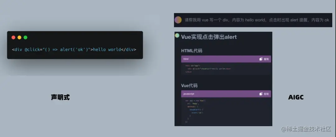 那 AIGC 式做到了吗?当然,否则也不用讲了对吧。声明式仍然需要前端工程师辛苦地码代码,即便有工具可以提效,但码农依旧得不到解放,至少大部分业务情况下是无法解放的。