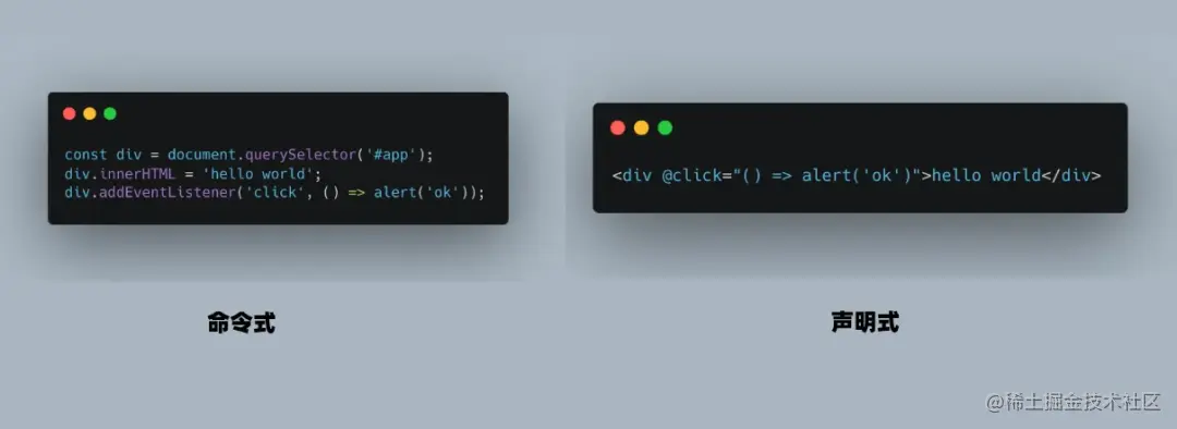 jQuery 是命令式开发的典型代表。这种范式的出现让前端开发变得高效,但还远远不够。因此,随着 Vue React 的现世,前端开发迅速地从命令式迁移到了声明式。