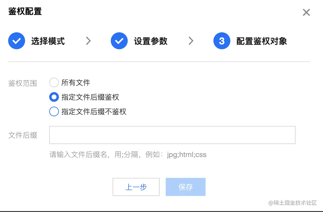 鉴权的对象可以是所有文件,也可以是指定后缀的文件鉴权或不鉴权