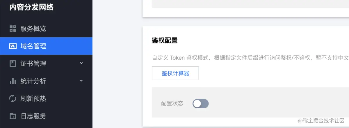登录腾讯云CDN控制台,点击『域名管理』--》选中『访问控制』Tab页面, 可以看到『鉴权配置』这一项, 如果配置状态开启了,则说明配置了URL鉴权, 可以详细查看鉴权类型。 如果没有开启则是如下灰色的状态。