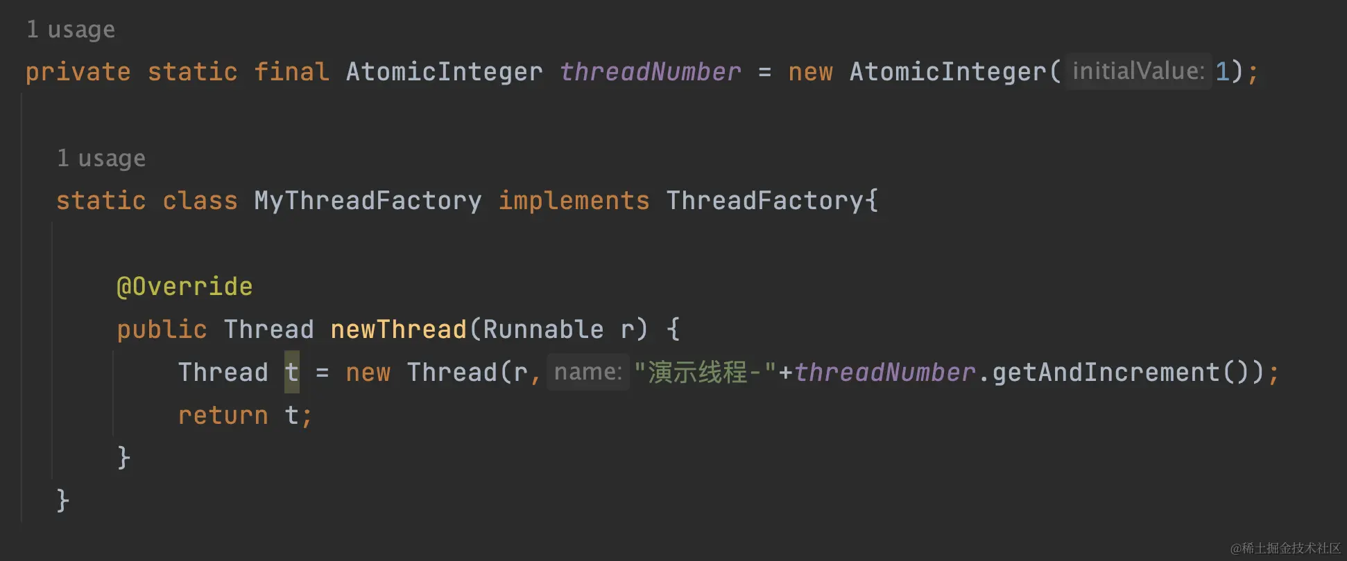 下图是我们自定义线程工厂的代码截图。图中自定义了线程工厂中的每个线程都以”演示线程-“开头,后面加上当前的原子整数值