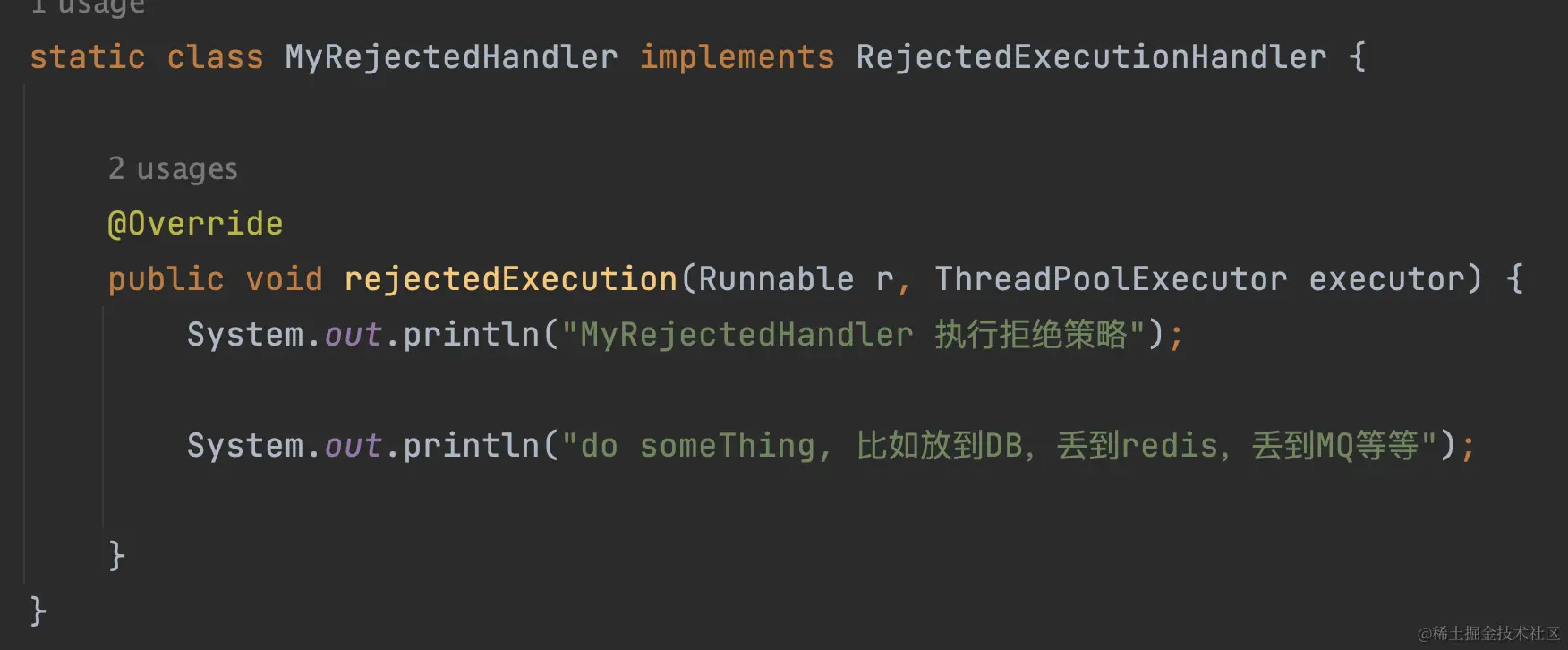 我们在日常开发过程中,还会遇到一些场景,需要自定义拒绝策略。比如我们有一些任务交给线程池去做,但是又需要当线程池打满的时候,自定义如何处理这些溢出的任务,比如落库,放到缓存中,或者丢给MQ等等。而想要自定义去处理这些溢出的任务,就需要我们自定义拒绝策略,方法是实现RejectExecutionHandler,重写rejectedExecution方法。截图如下