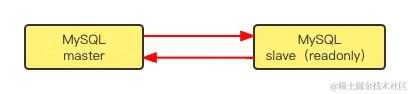 关于 MySQL 主从搭建,我们在项目中,更常见一种结构是双 M 结构,即两个 MySQL 实例,每个 MySQL 实例互为主备,这样在主节点突然断电或者不可用的时候,slave 节点可以很快切换为 master,架构图如下: