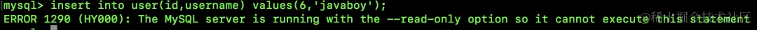 这个 read_only 对 super 用户无效,所以设置完成后,接下来我们退出来这个会话,然后创建一个不包含 super 权限的用户,用新用户登录,登录成功之后,执行一个插入 SQL,结果如下: