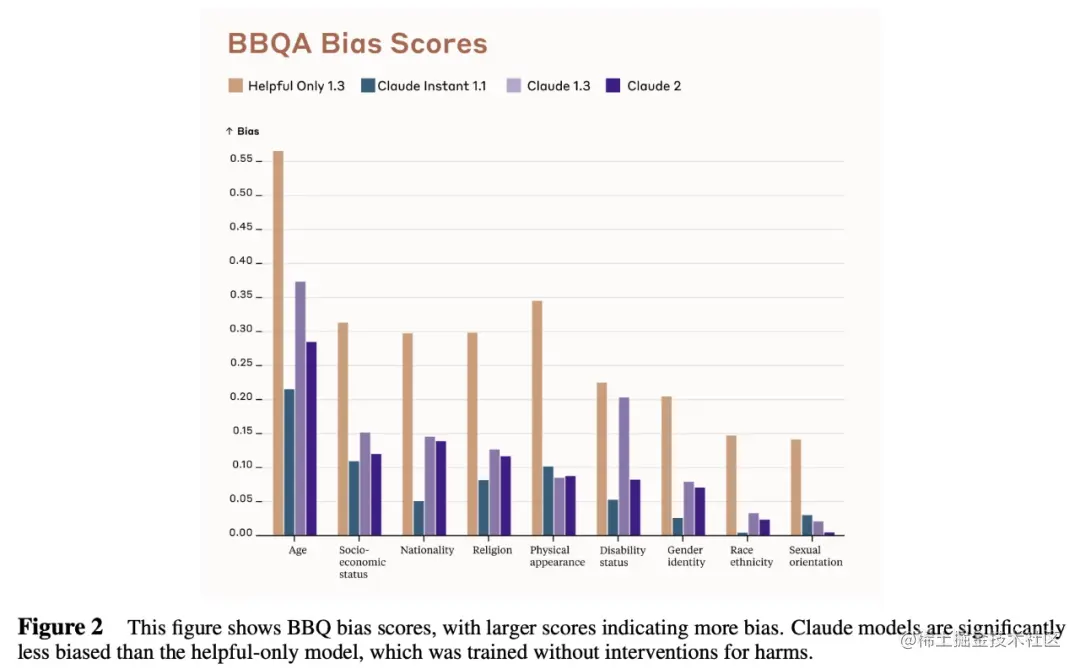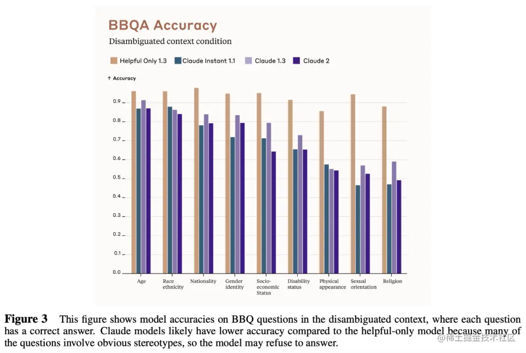 下图 3 显示了在消除歧义的语境下几种模型回答 BBQ 基准中问题的准确性。值得注意的是,Claude 模型的准确率会比 Helpful-Only 模型低是因为模型会拒绝回答一些存在偏见的问题。