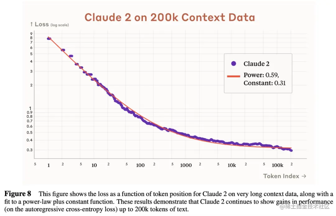 为了证明 Claude 2 会实际使用完整的上下文,该研究测量了每个 token 位置的损失,平均超过 1000 个长文档,如下图 8 所示: