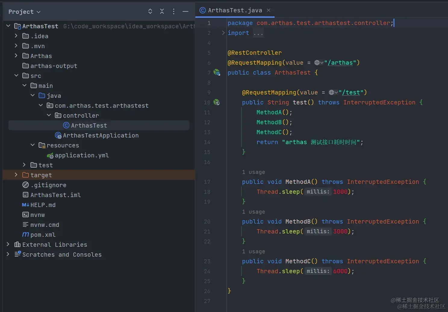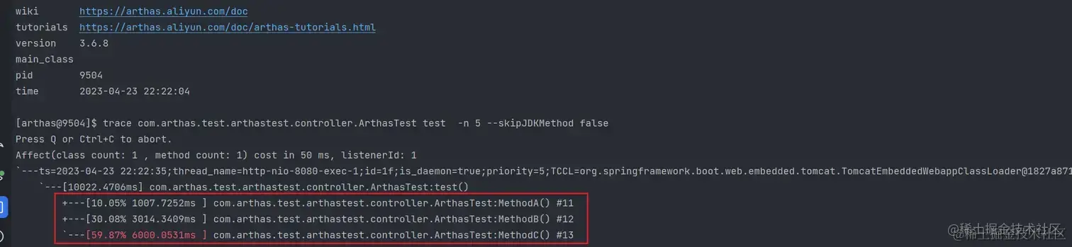 可以看到我们的接口的方法的响应时间,MethodC()执行时间是最长的,红色的,然后代码在13行,我们就可以去找到13行,定位到具体的位置了。
