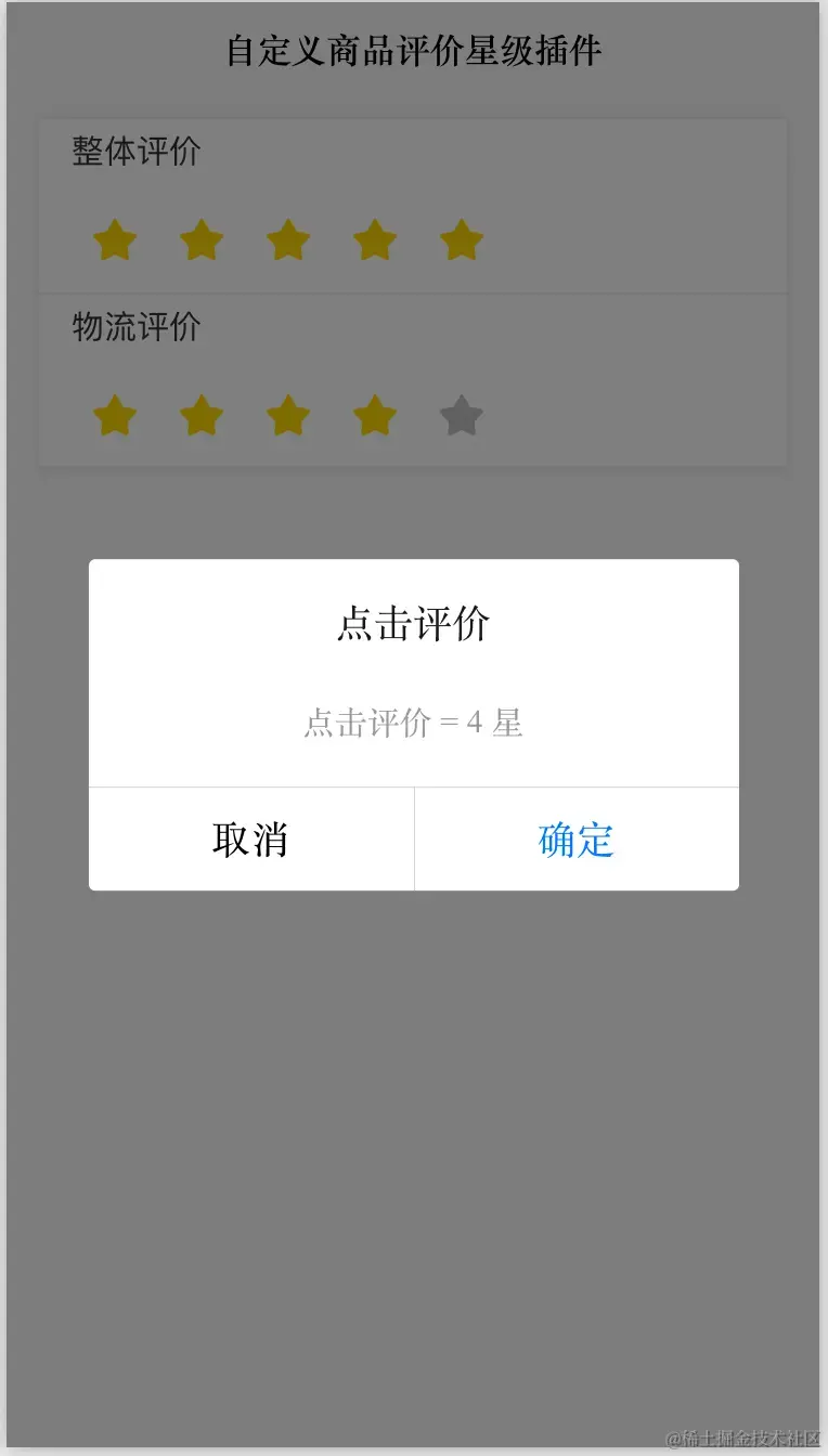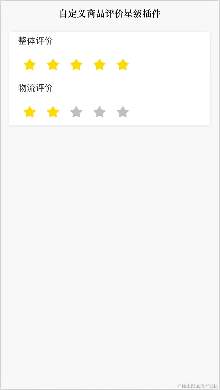 stars和starsTwo数据属性中的星级对象,调整评分的初始状态。每个星级对象有一个types属性,用于表示该星级是否被选中。 - 自定义样式:根据你的设计要求,可以在样式部分对评分容器和其他相关元素进行样式调整。