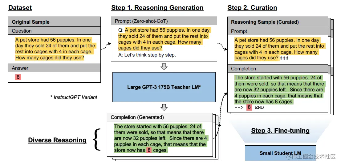 想要让小模型拥有COT能力,多数方案是通过COT样本微调来实现的,以下Reference[1]-[4]中的4篇论文的核心差异就在COT样本构造和微调方式。以下我们把几篇论文合在一起来说,下图来自[3]