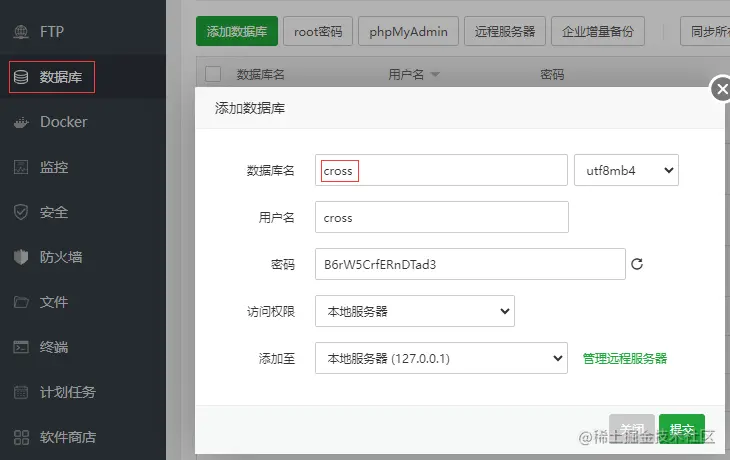 再手动导入数据库 cross,在宝塔数据库中先创建数据库 cross。