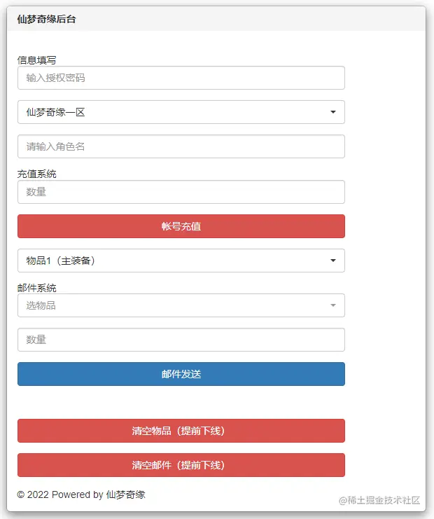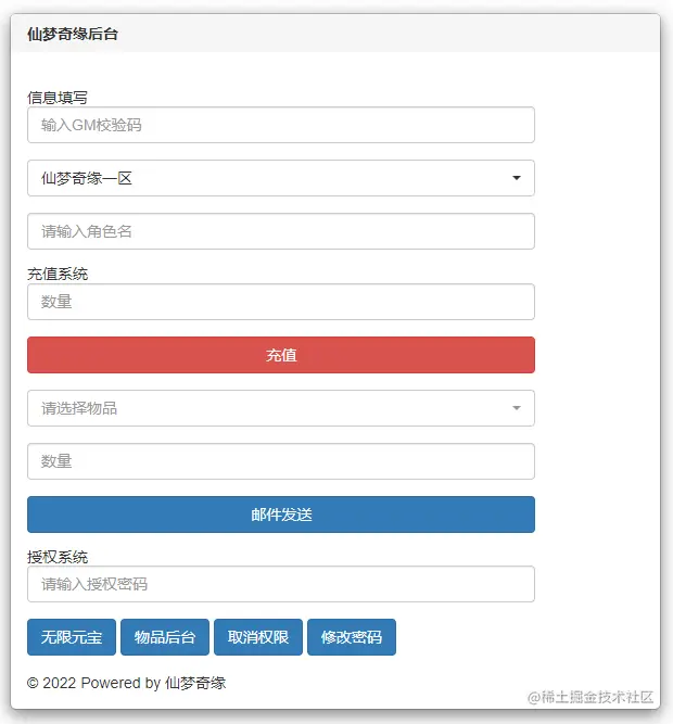 游戏后台 GM 授权链接:http://IP:9981/gm/gm.php,可进行充值、物品发送、添加取消授权等、修改授权密码等功能,修改 /www/wwwroot/xmqy/gm/user/config.php 文件中 $gmcode 字段可设置 GM 码。