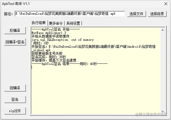 安装好JAVA环境后,找到资源中的签名工具 ApkTool,将修改好后的 APK 文件拖到工具路径中,点击签名,过程中提示获取版本号失败可无视,不会影响最终签名。
