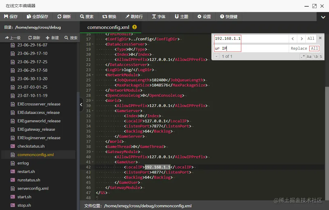 以第一个 commonconfig.xml 文件为例,在宝塔中找到文件,双击修改,Ctrl+F 批量替换 IP。