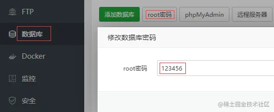 宝塔数据库菜单中修改root密码为123456。