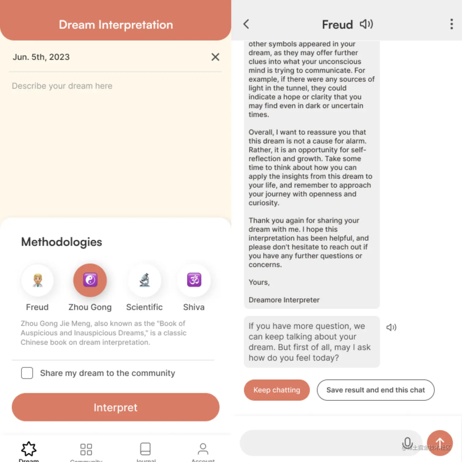 成立于2023年,Dreamore AI通过AI技术对用户梦境进行多流派的解释和描绘。通过在Web端和App端的对话框中输入对梦境的自然语言描述,Dreamore AI就可以基于“弗洛伊德”“周公”“湿婆”“现代科学”等梦境解析主流学派理论,对输入梦境进行解析,并生成梦境描述相关图片。