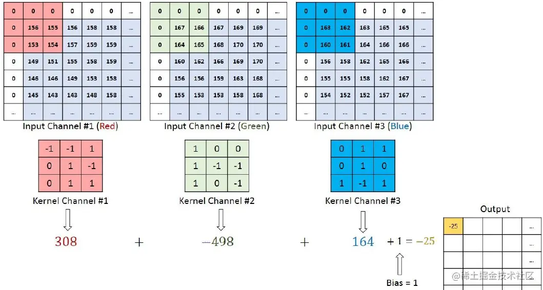 也就是每个卷积核在 input_channel 维度再划分,这里 input_channel 为 3,那么这时每个卷积核的 shape 是(3, 3)。3 个卷积核在输入图像的每个 channel 上卷积后得到 3 个数,把这 3 个数相加,再加上 bias,得到最后的一个输出。