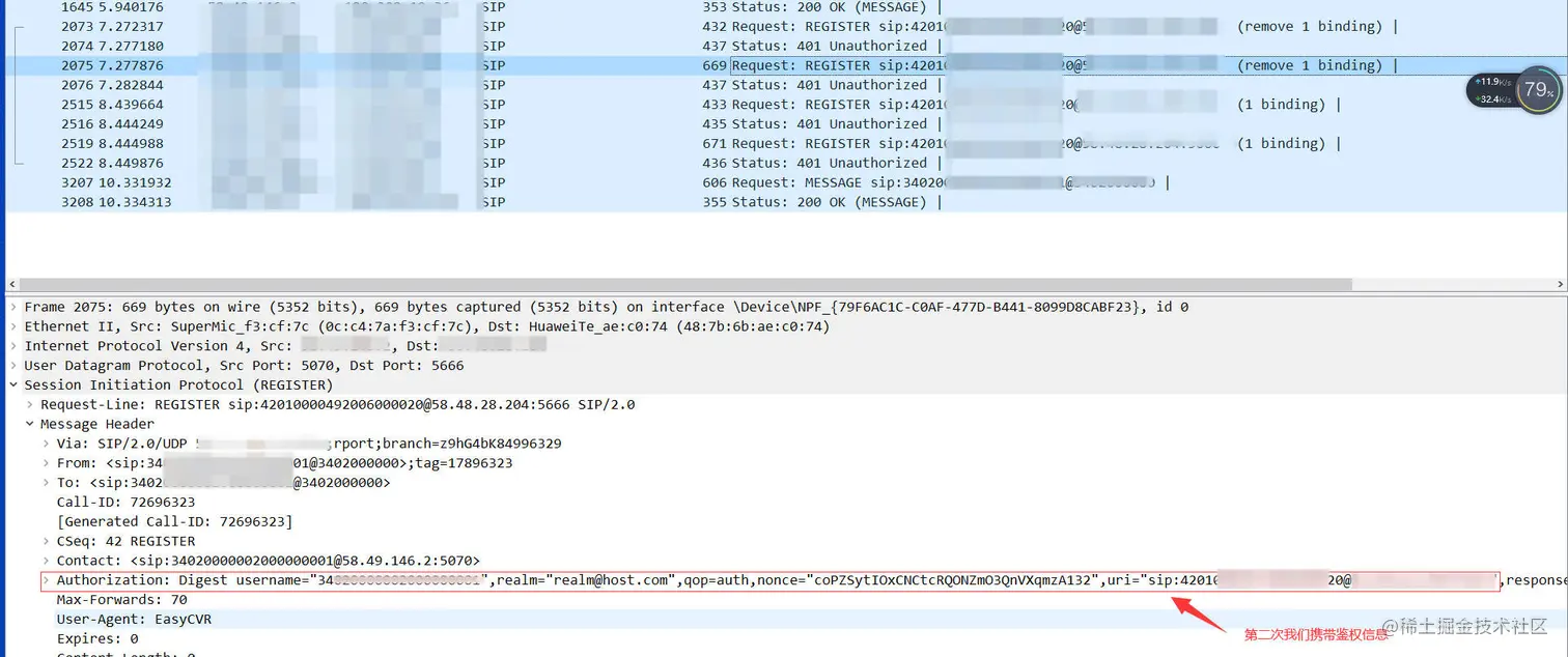 通过抓包发现,用户的EasyCVR注册两次均返回401,这说明鉴权失败,检测上级平台的接入密码,发现和EasyCVR配置的级联也是一样的。