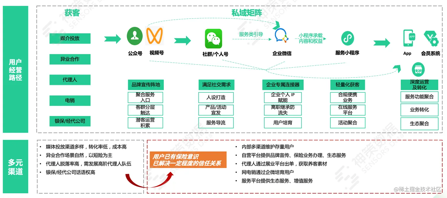 保险交易相对复杂且链条较长,通过线上线下一体化经营提升效率就变得很关键。保险企业一方面逐步丰富企业自身的数字化经营布局,另一方面通过多元营销获取更多销售线索,目标是构建企业专属的私域流量池,通过公众号、视频号、App、企业微信、小程序等多渠道联合运营存量客户,提升品牌认知度、完善保险生态链。
