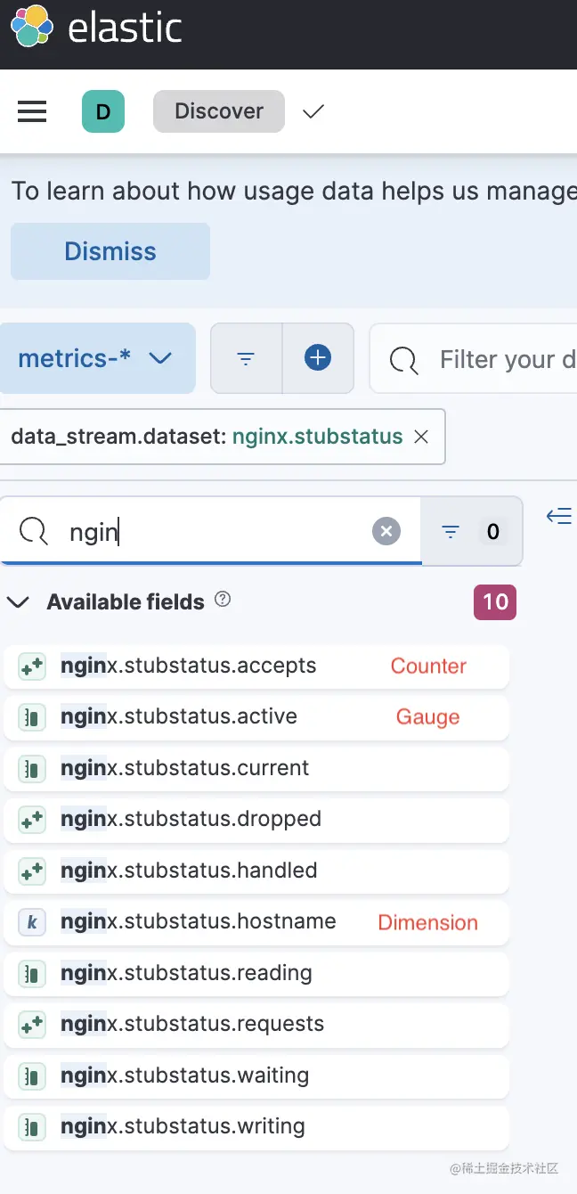 Elastic 为时间序列指标提供全面的搜索和可视化。 可以在 Discover 中按原样搜索时间序列指标。 在下面的搜索中,计数器(counters)和仪表(gauges)指标被捕获为不同的图标。 下面我们还提供了使用 Nginx 集成包中包含的 Lens 和 OOTB 仪表板进行时间序列指标可视化的示例。