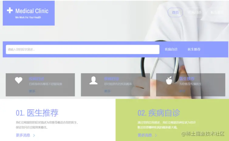 本项目主要实现了疾病自诊和医生推荐两个功能并构建了医生服务指标评价体系。疾病自诊主要通过利用BERT+CRF+BiLSTM的医疗实体识别, 建立医学知识图谱, 从而实现基于患者问诊文本的疾病初诊。这个功能帮助患者初步了解自身的疾病情况并为下一步与医生的交流提供支持。 第二个功能是医生推荐。本平台采用基于Jacard距离的Minhash和minhashLSHForest算法来进行推荐, 匹配患者的咨询文本和医生的历史问诊信息,从而为患者推荐最适合的医生。最后我们使用django框架进行项目发布。