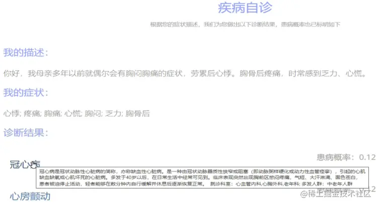 在疾病自诊模块,平台会读取用户疾病描述的语义信息,首先进行文本预处理,然后通过实体识别模型抽取出其中的关键成分,即:疾病症状、并发症、身体部位等医学实体。然后,这些医学实体会输入到平台后端的知识图谱(基于大规模数据集构建)中。最终,通过知识图谱的快速查询和计算,平台将返回基于患者疾病描述的疾病推断以及相应的概率值。同时,疾病相关的介绍、需要去就诊的科室和疾病多发人群的相关信息也会推送给用户。