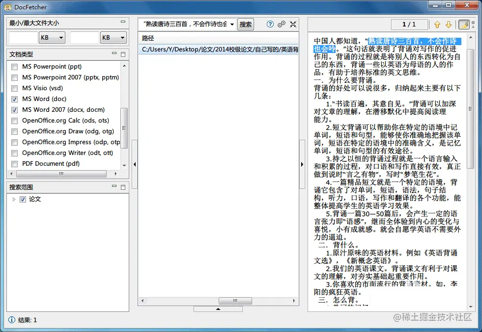 DocFetcher是一个桌面搜索工具,可以让你快速地在文件中查找关键词。你可以指定要搜索的文件夹和文件类型,然后输入关键词,DocFetcher会显示匹配的文件和文本片段。你也可以使用高级搜索语法来过滤和排序结果。