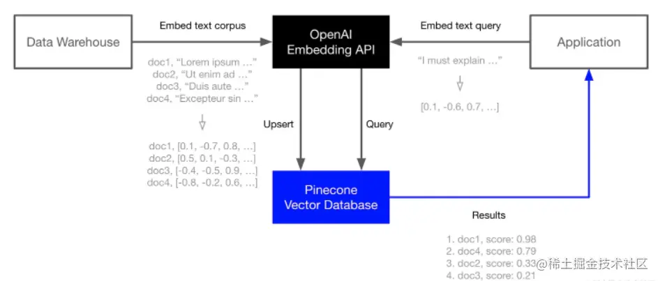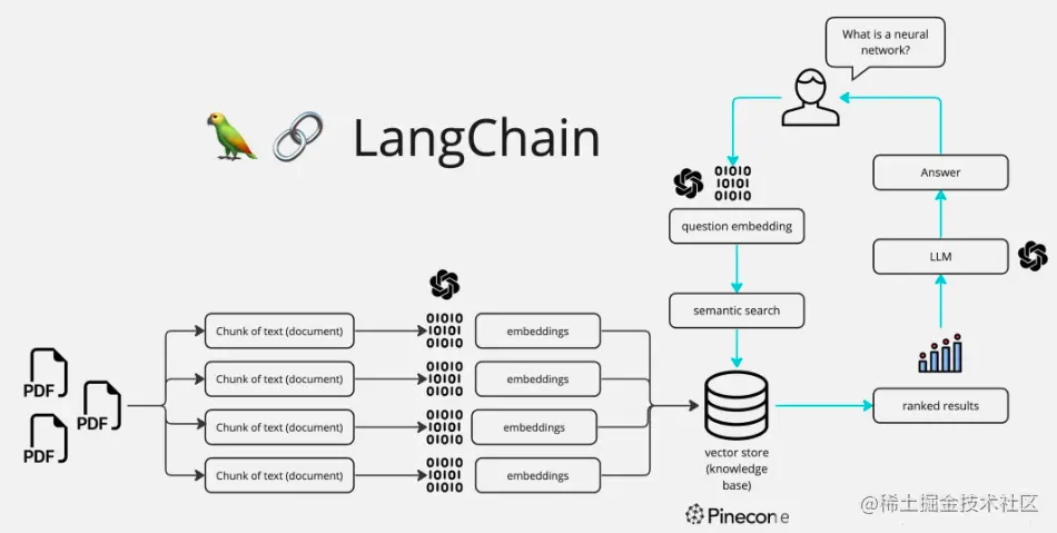 1、将垂直行业领域的知识库文档进行Embedding向量化处理,并将处理后的语义向量Vectors存入向量数据库Vector Database中(这个步骤中还包括对非结构化数据先转化成文本数据,并对长文本进行Splitter分割处理)