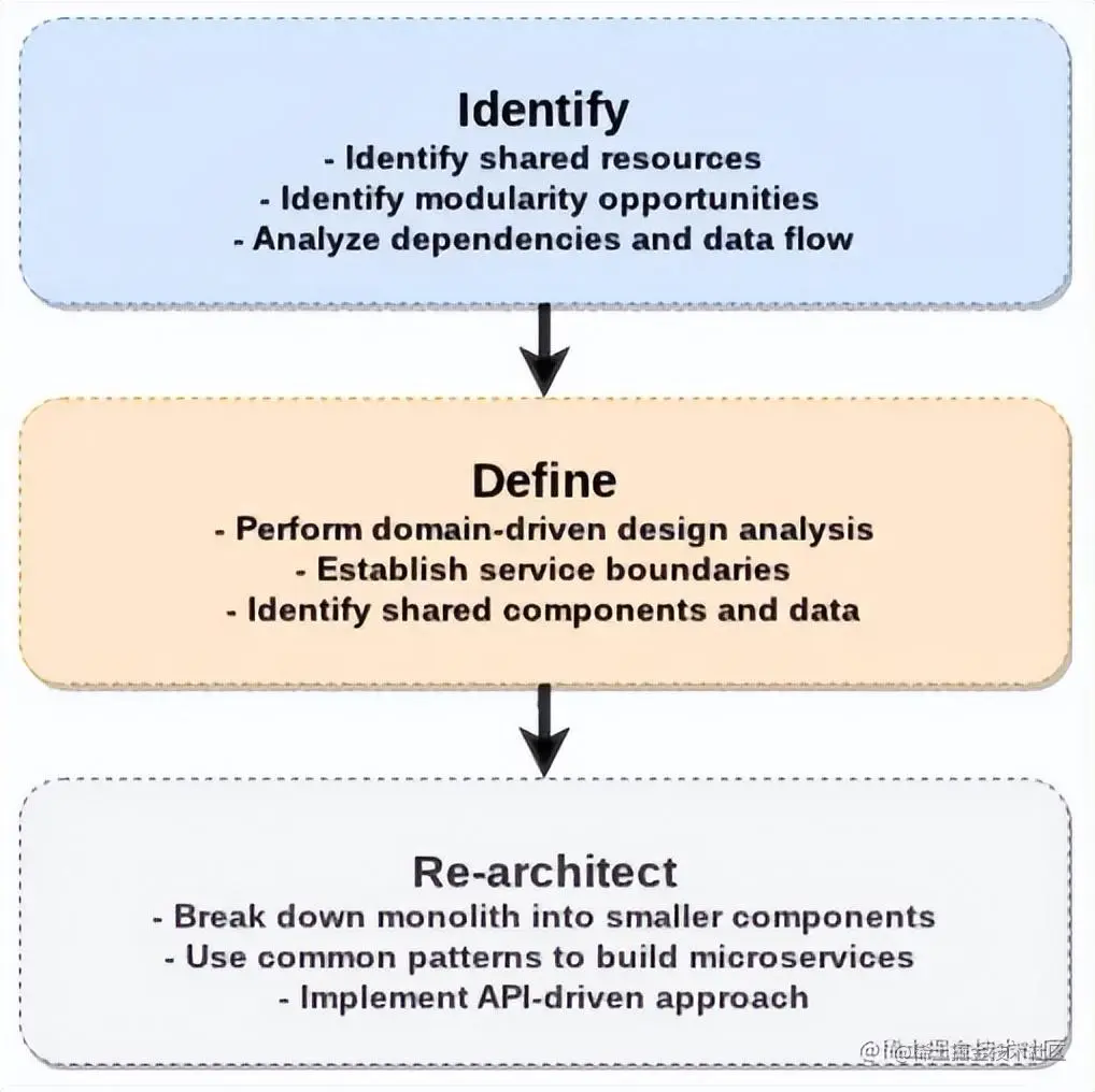 从整体架构到容器的迁移过程通常经历三个阶段。每个阶段都侧重于解决特定挑战并逐步转换架构以优化效率、灵活性和可维护性: