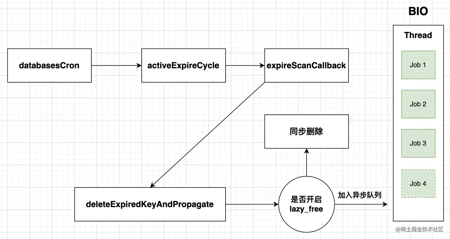 在deleteExpiredKeyAndPropagate()函数内调用dbGenericDelete()函数内部执行删除操作的时候,如果开启了lazy_free机制,会调用freeObjAsync()函数,通过bioCreateLazyFreeJob()方法将这个key的内存回收操作包装为一个任务,塞进异步任务队列,后台的lazy_free线程就会从这个异步队列里面取任务并执行。否则,就会在当前的线程内执行内存释放操作。