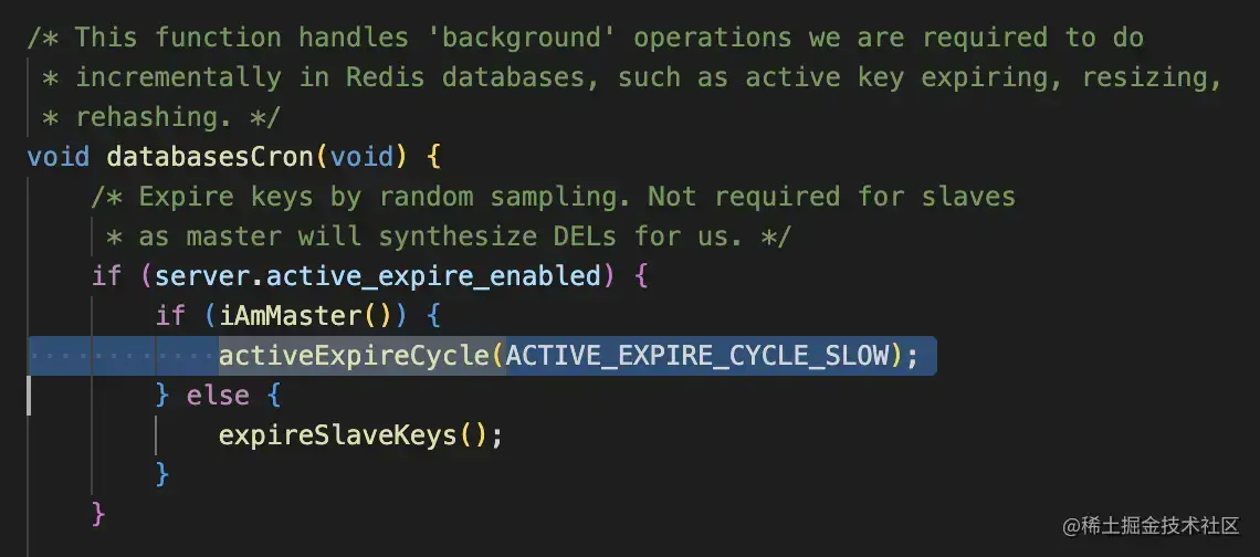 Key的过期定时删除操作,是在负责Redis后台任务中的databasesCron()函数执行的,如下所示。在这个代码中可以发现,当开启主动过期删除选项,且当前是在主节点上执行时(因为从节点会接收主节点传递的DEL/UNLINK命令),会调用activeExpireCycle()函数执行定期删除策略。