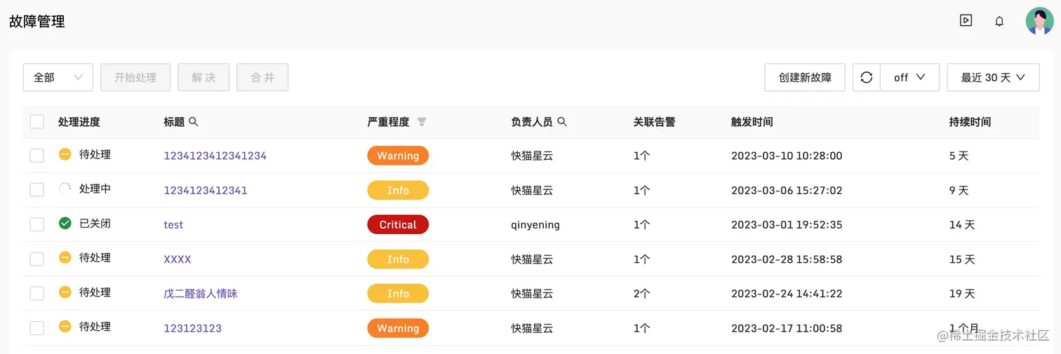 有的时候某个告警事件发出来,追查之后可能发现是依赖的数据库或者基础网络的问题,我这个团队自己就搞不定了,需要跨团队协同,此时可以把告警升级为故障,大家基于故障做协同,比如在故障下面做评论,贡献自己掌握的排查线索,基于这个信息未来可以做复盘。
