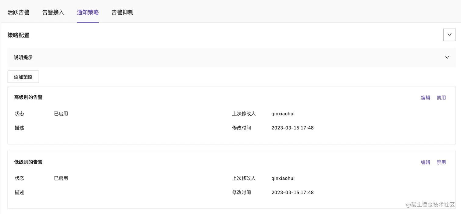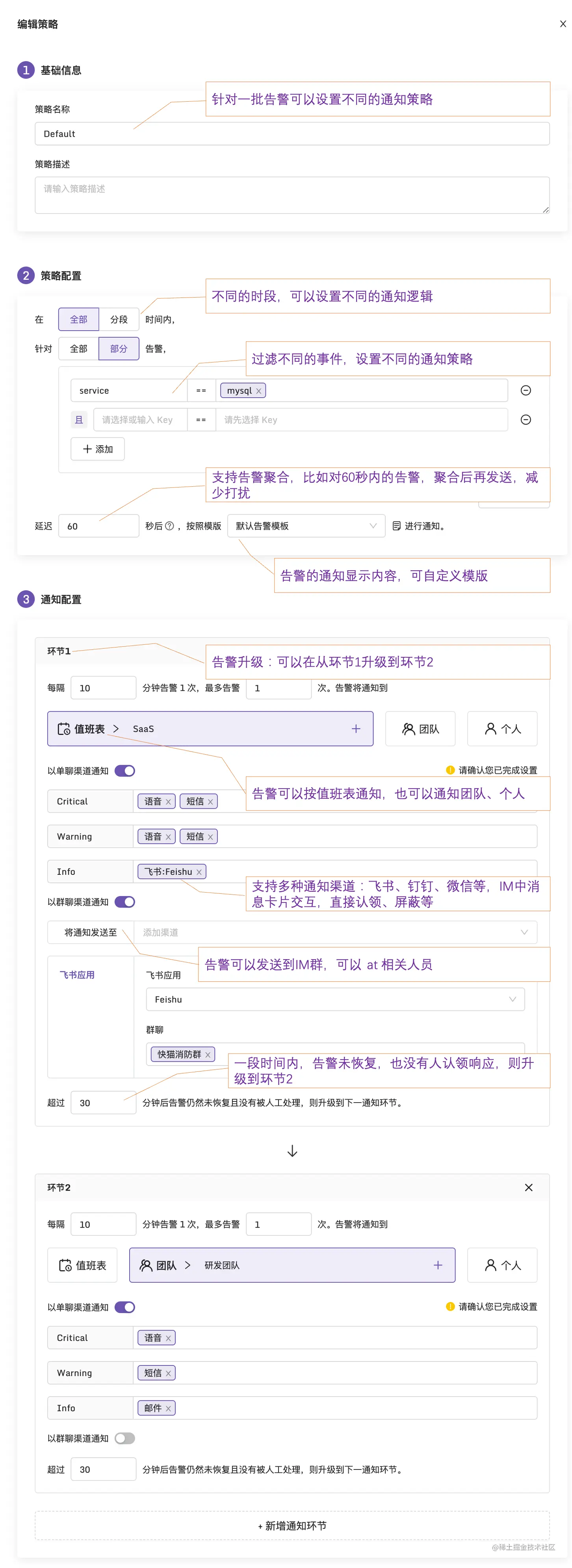 针对不同的告警,可以设置不同的通知策略,比如高级别的告警使用电话通知,低级别的告警只使用邮件和IM通知: