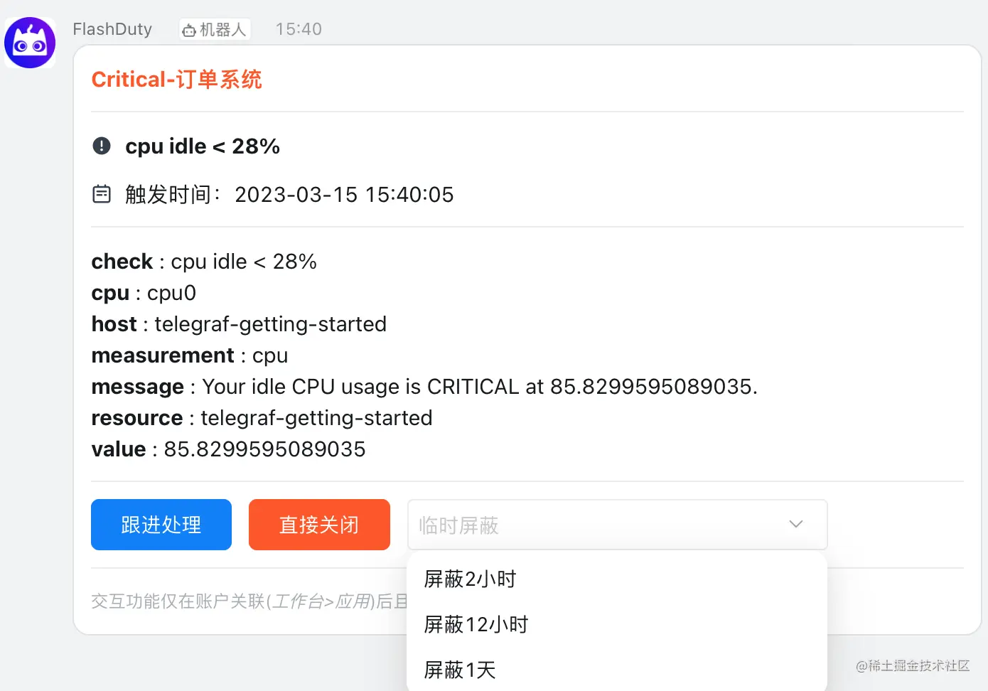 不同时段、不同的事件可以有不同的发送策略,支持配置聚合窗口做告警聚合,减少通知打扰,支持配置排班,告警只发给值班人,当然,也支持发给整个团队,支持发给钉钉、飞书、企微,支持机器人的发送方式,也支持应用的方式,应用的发送方式支持卡片视图(卡片视图样例如下,那一坨英文是可以自定义成中文的),可以在卡片里认领告警、屏蔽告警,这个体验是相当丝滑的。如果告警触发之后,长时间没有人响应,告警也一直没有恢复,可以触发告警升级机制,升级给leader或者backup的人,保证告警闭环。另外还支持配置不同的告警通知模板,自定义展示内容。