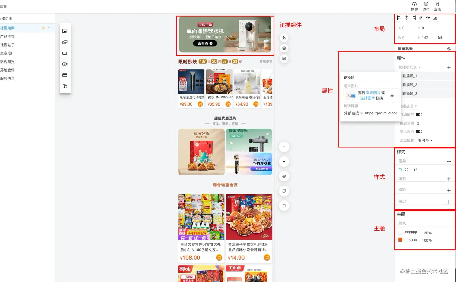商品滑窗,商品列表等组件,还可以设置内部卡片的一些样式,如名称颜色,卡片圆角等相关内部主题样式信息
