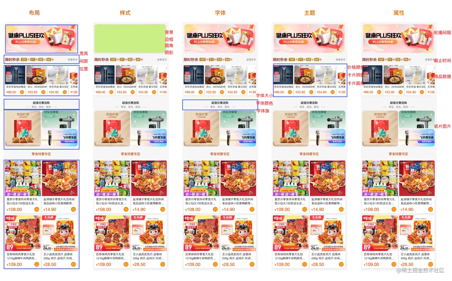 我们分类一下, 组件共有布局,样式,字体等信息, 组件差异的, 属性,主题等信息