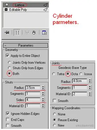 重要的是,从场景中选择一个圆柱体对象,按“shift”并单击该对象进行复制。不要将复制的对象从原始位置移动。现在添加具有以下参数的“格”修饰符。