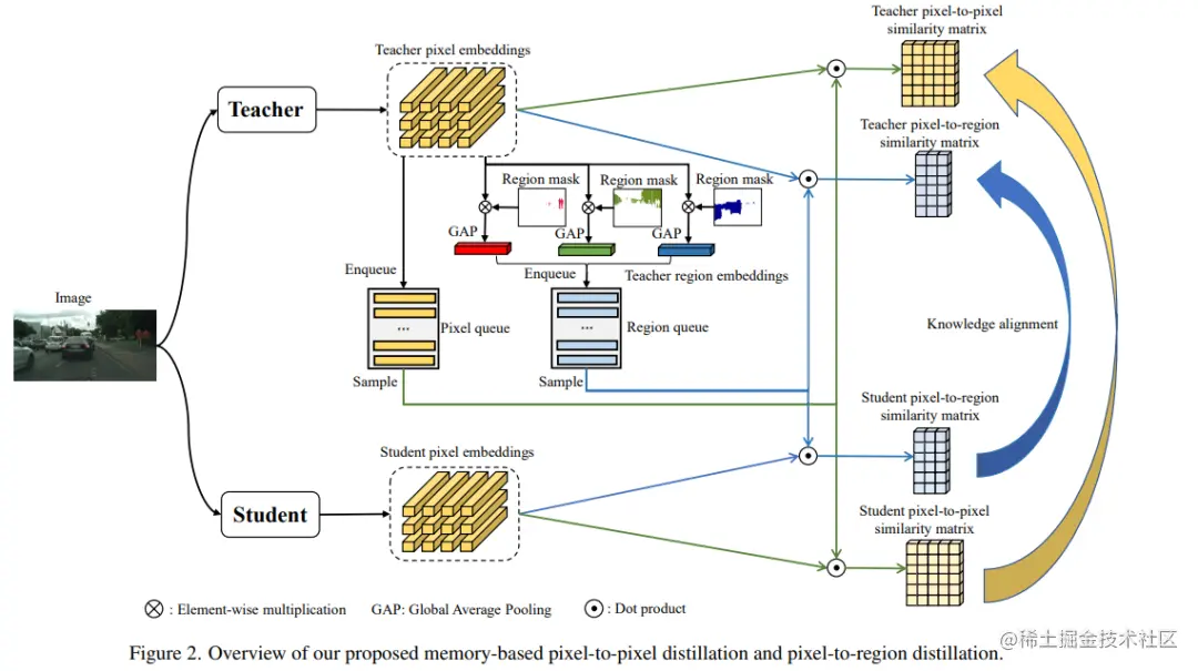具体来说,本文提出了像素到像素的蒸馏和像素到区域的蒸馏以充分利用各种图像之间的结构化关系。CIRKD引导学生网络从教师那里学习训练图像的全局像素结构特性,进一步提高了分割性能。作者在Cityscapes,CamVid和Pascal VOC三个分割基准数据集上进行了评估。实验结果表明,CIRKD优于其他最先进的蒸馏方法,这证明了在语义分割中转移全局像素关系的价值。