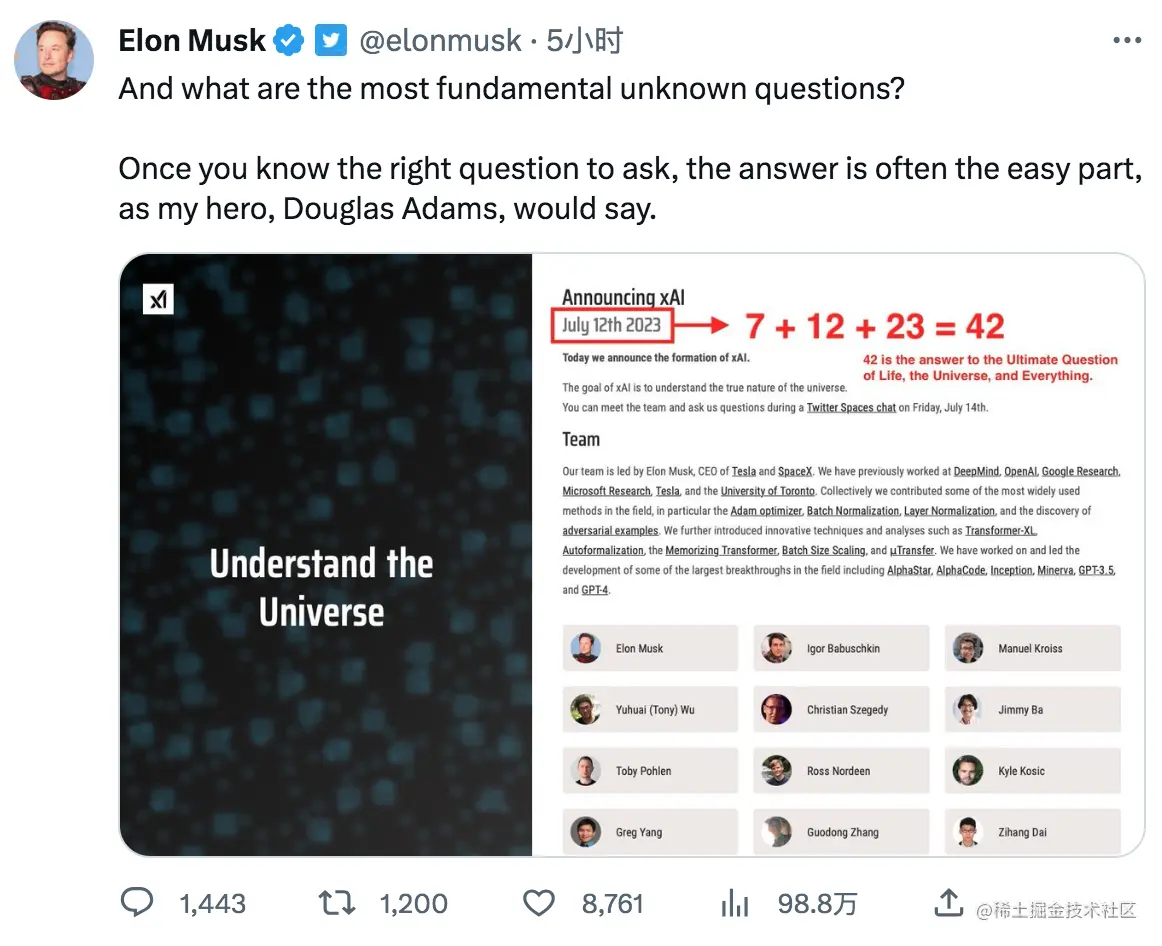 xAI的发布日期加起来等于数字42,据传马斯克特别喜欢一部作品叫做《银河系漫游指南》,其中一台名叫“深思(Deep Thought)”的超级计算机被制造出来,花了750万年时间计算一个终极问题的答案:“生命、宇宙和一切的意义”——最后答案为42。后来,42也成为极客间的著名暗语。