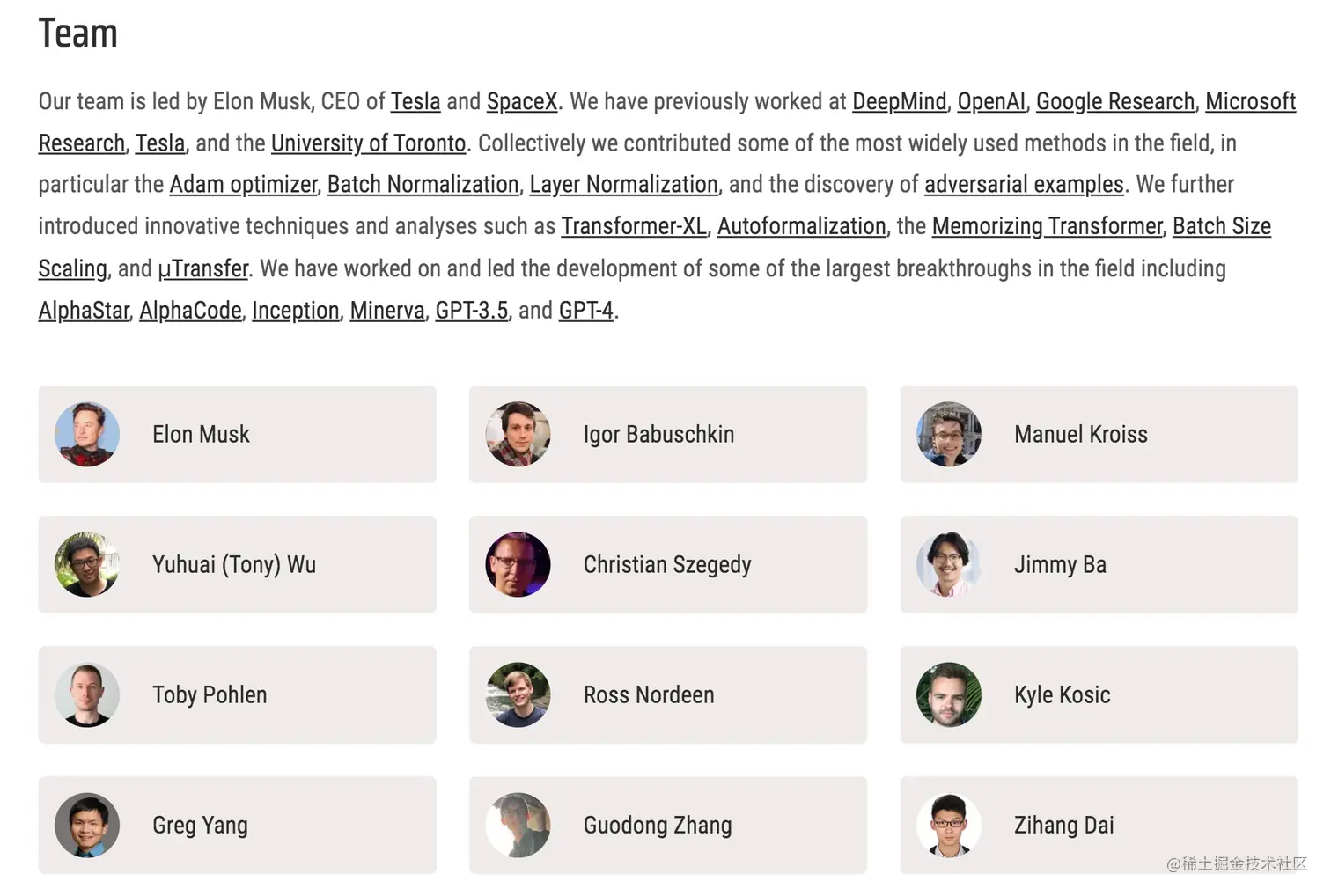 据企业网站介绍,xAI公司的初创成员除马斯克之外的11名成员也都在AI行业有过一定的建树,也有曾参与过GPT-3.5和GPT-4项目研究的经验。