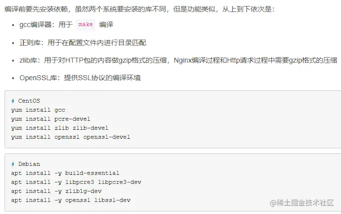 从上面的表格中可以看出 RedHat 系和 Debian 系的安装工具有所区别,这也就是为什么我前面要强调先区分发行版系统再执行命令,在 Debian 中执行 yum 是不可行的,虽然我们可以把 yum 安装到 Debian 中,但这显然违反了设计的初衷,因为 Debian 已经有 apt 了,另外需要注意的是,即使是同样功能的依赖库,软件包的名字可能也是不一样的,可能是因为由不同的人开发了相同功能的软件,例如编译 Nginx 所需要的 5 个依赖: