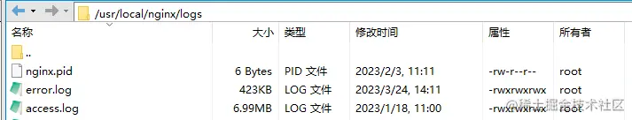 Nginx 的默认日志文件为/usr/local/nginx/logs/access.log,通过下图可以看到它的权限 rwxrwxrwx,可以简单来说就是完全权限,任何人都可以读、写或删除,如果我们想让 Nginx 在 /usr/local/nginx/logs这个目录中写自定义日志会得到没有权限的错误,因为 nobody 这个用户没有对这个目录的读写权限。